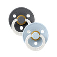 تم تصميم مجموعة من 2 لهايات BIBS Color GLOW باللونين الحديدي / بيبي بلو لتوفر للطفل الراحة والأمان ليلاً ونهارًا. تم تجهيز مجموعة NIGHT بمقبض فسفوري يتوهج في الظلام ليتمكن من العثور على اللهاية بسهولة دون إيقاظ الطفل.