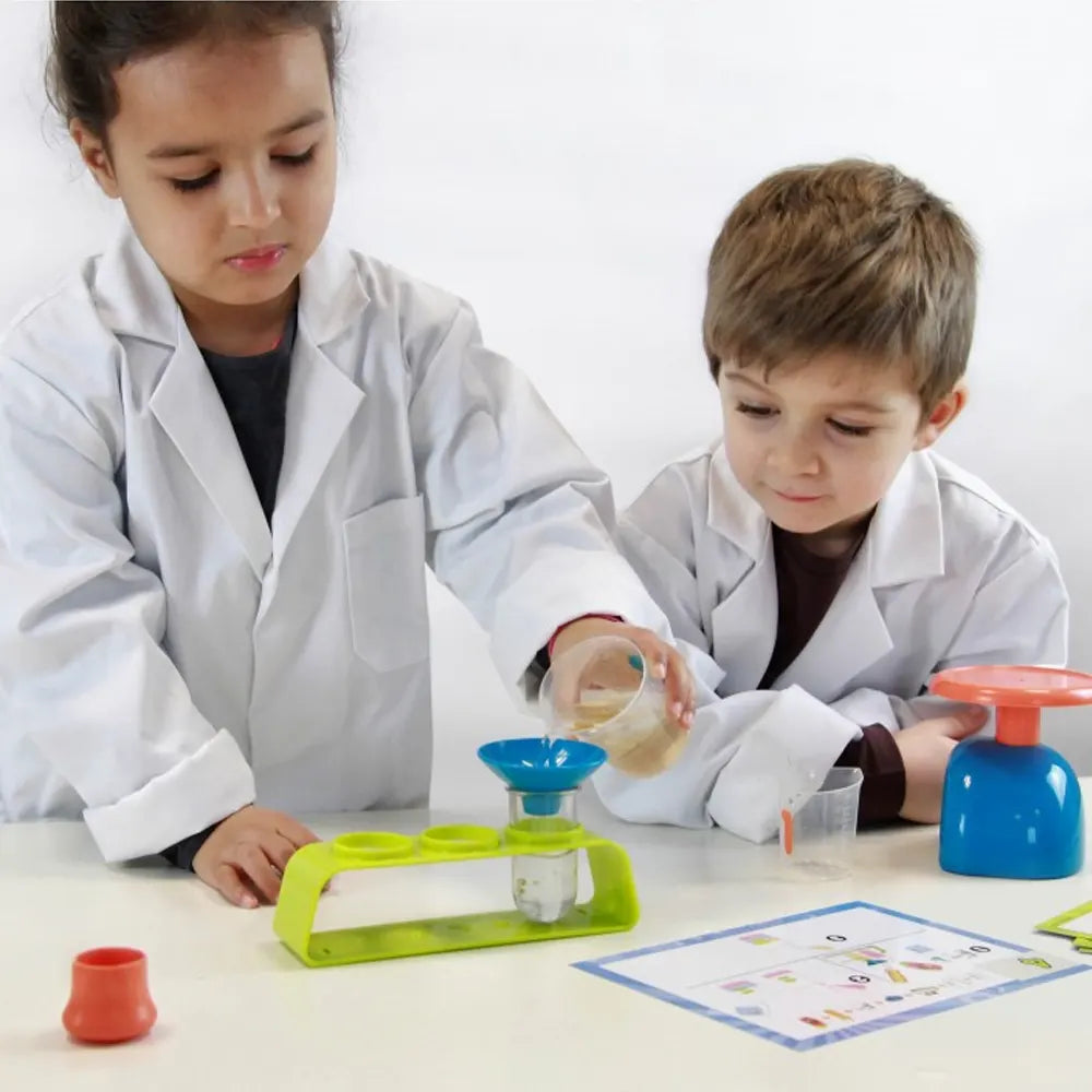 تحتوي على: 3 كؤوس (صغير، متوسط، كبير)، 2 أنبوب اختبار + سدادات، حامل، قمع، ماصة، ميزان، تعليمات مصورة، 10 بطاقات تجارب.