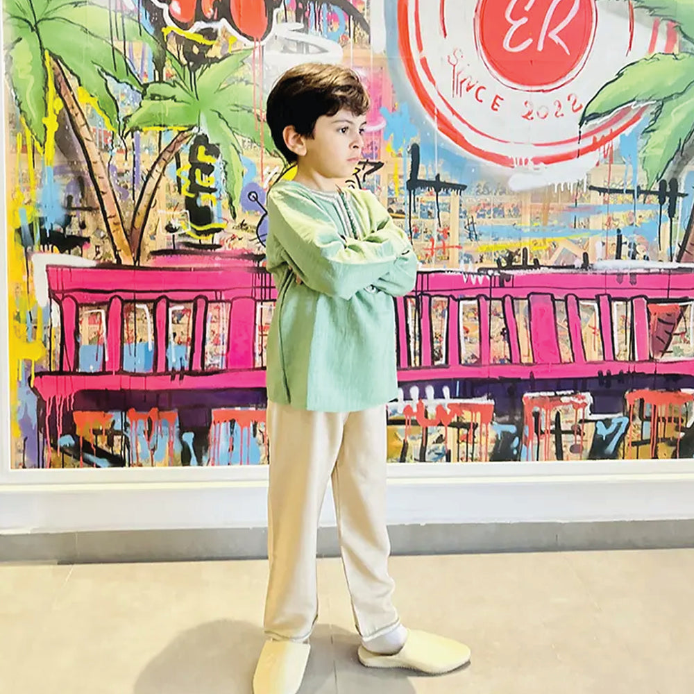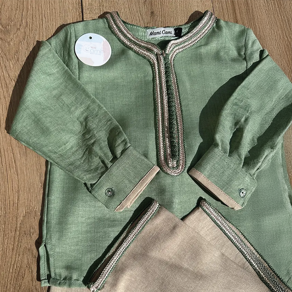 جبادور للأولاد قطعتين من الكتان الأخضر الفاتح، مثالي للمناسبات الخاصة. تجمع هذه المجموعة التقليدية بين الأناقة والراحة. الجزء العلوي مزود بسحاب عملي أسفل الأزرار، والبنطلون ذو خصر مطاطي.