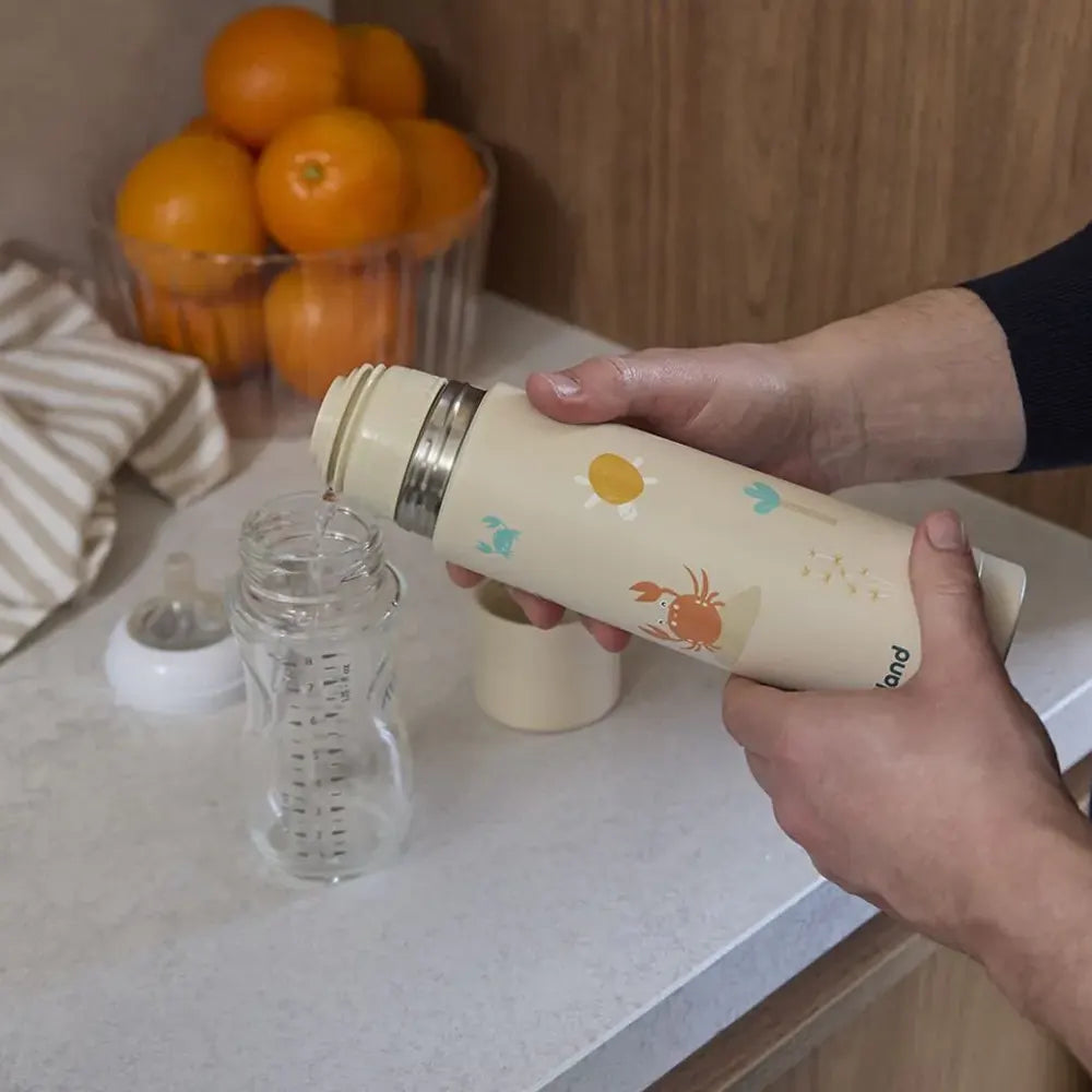 حافظ على مشروبات طفلك في درجة الحرارة المثالية لأكثر من 24 ساعة بفضل ترمس ميني لاند 500 مل بنقشة السرطان المرحة. مثالي للوجبات في المنزل أو خارجه، فهو يجمع بين العملية والأمان والأداء الحراري.