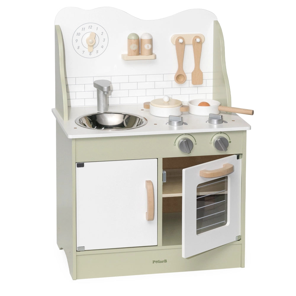 يوفر مطبخ Viga Toys PolarB الخشبي، بألوانه الباستيل البيضاء والخضراء، مساحة لطيفة وأنيقة لتشجيع الصغار على استكشاف إبداعهم في الطهي.