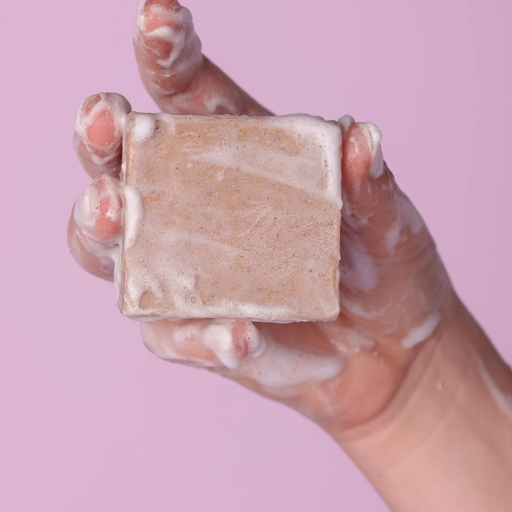 يوضع الصابون مباشرة على الوجه بحركات دائرية، ثم يشطف >