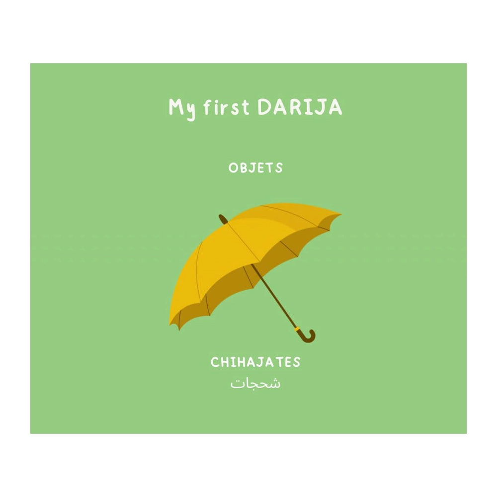 the name of the object in Darija as well as in phonetics to make reading easier, in French, the language of daily life and school.