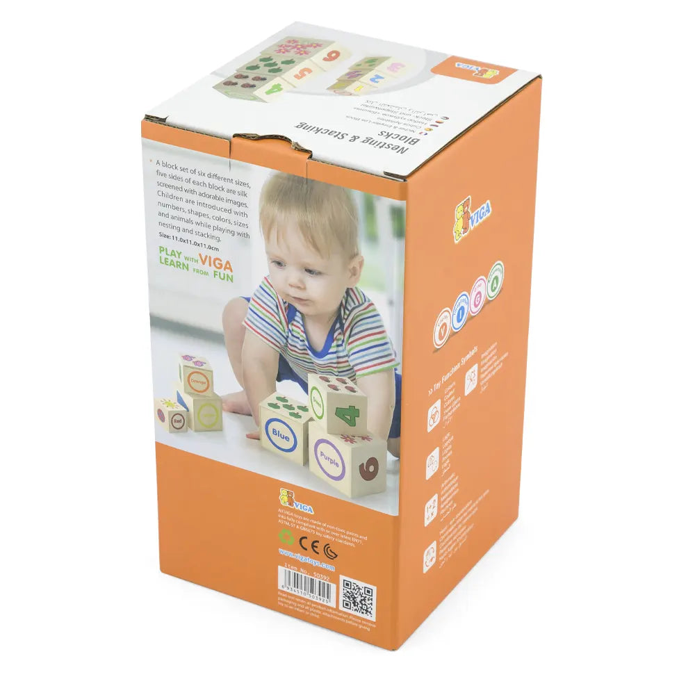 These colorful wooden blocks from Viga Toys allow children to discover numbers, shapes, colors, and animals while having fun. The set includes 6 cubes of different sizes that can be stacked to form a tower, a pyramid, or any other imagined construction.
