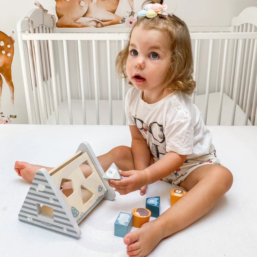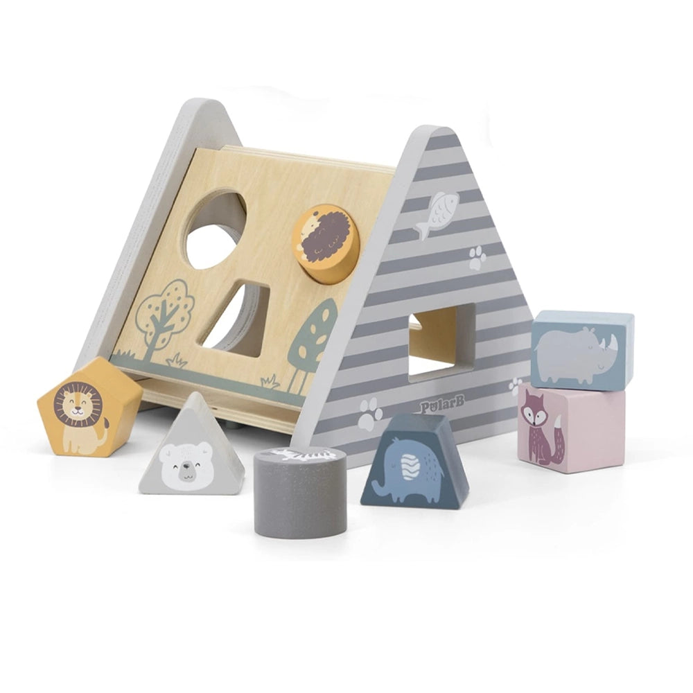 Made of varnished wood and painted with non-toxic paints in "polar" colors, this shape sorter combines safety, durability, and fun.