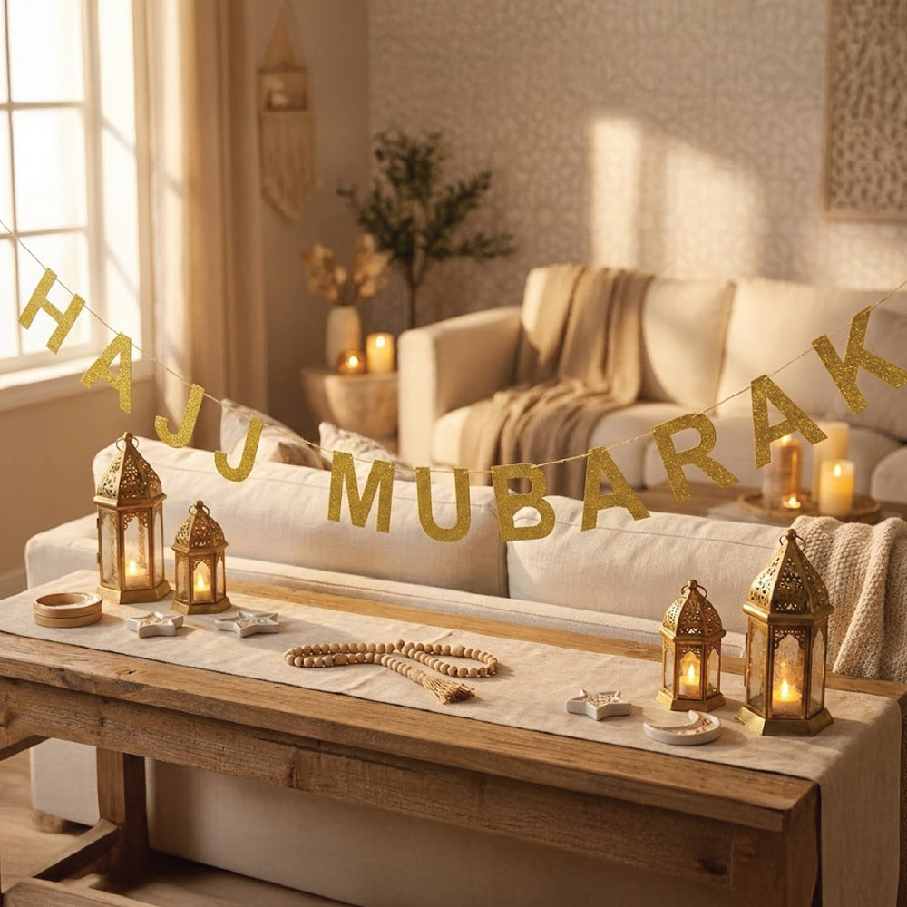 Fácil de instalar, esta pancarta con brillantina es un accesorio imprescindible para celebrar el Hajj con estilo y alegría.