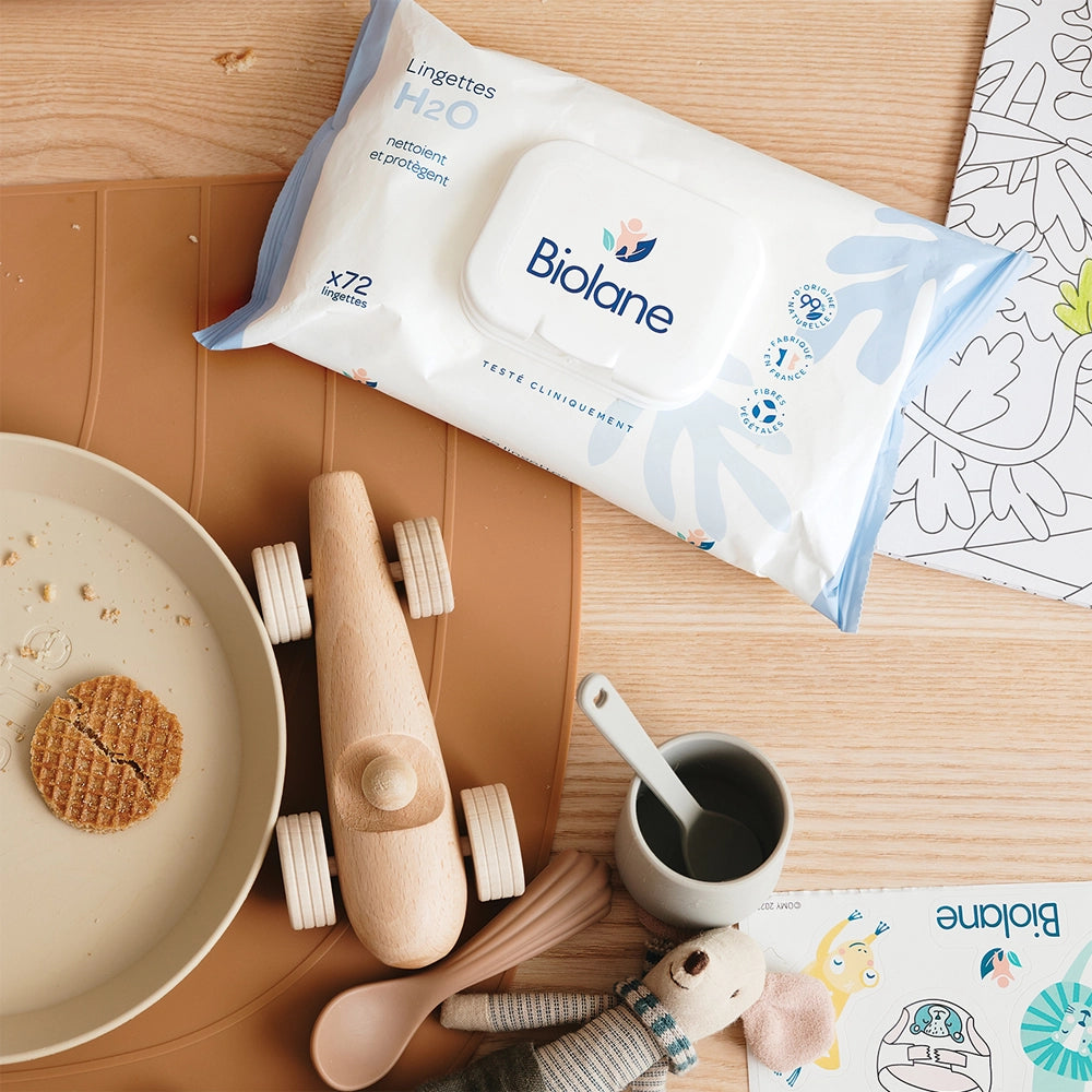 Formuladas con 99 % de ingredientes de origen natural, las toallitas gruesas Biolane H2O permiten limpiar y proteger el culito del bebé en un solo gesto. Sus fibras 100 % biodegradables las convierten en una opción respetuosa con el medio ambiente.