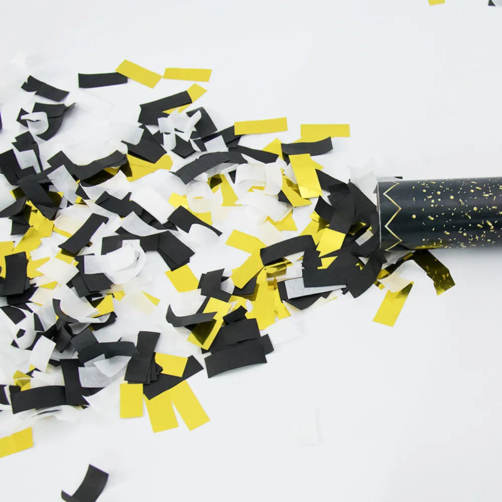 ¡Transforme sus fiestas en momentos inolvidables con este cañón de confeti dorado! Este lanzador fácil de usar libera una lluvia brillante de confeti y serpentinas doradas, aportando instantáneamente un ambiente festivo y elegante.