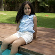 Enamórate de la camisa a rayas turquesa de Loly, una prenda ligera y elegante, perfecta para los días soleados. Esta camisa sin mangas para niña luce un bonito cuello Peter Pan con volantes que le da un toque refinado y delicado.