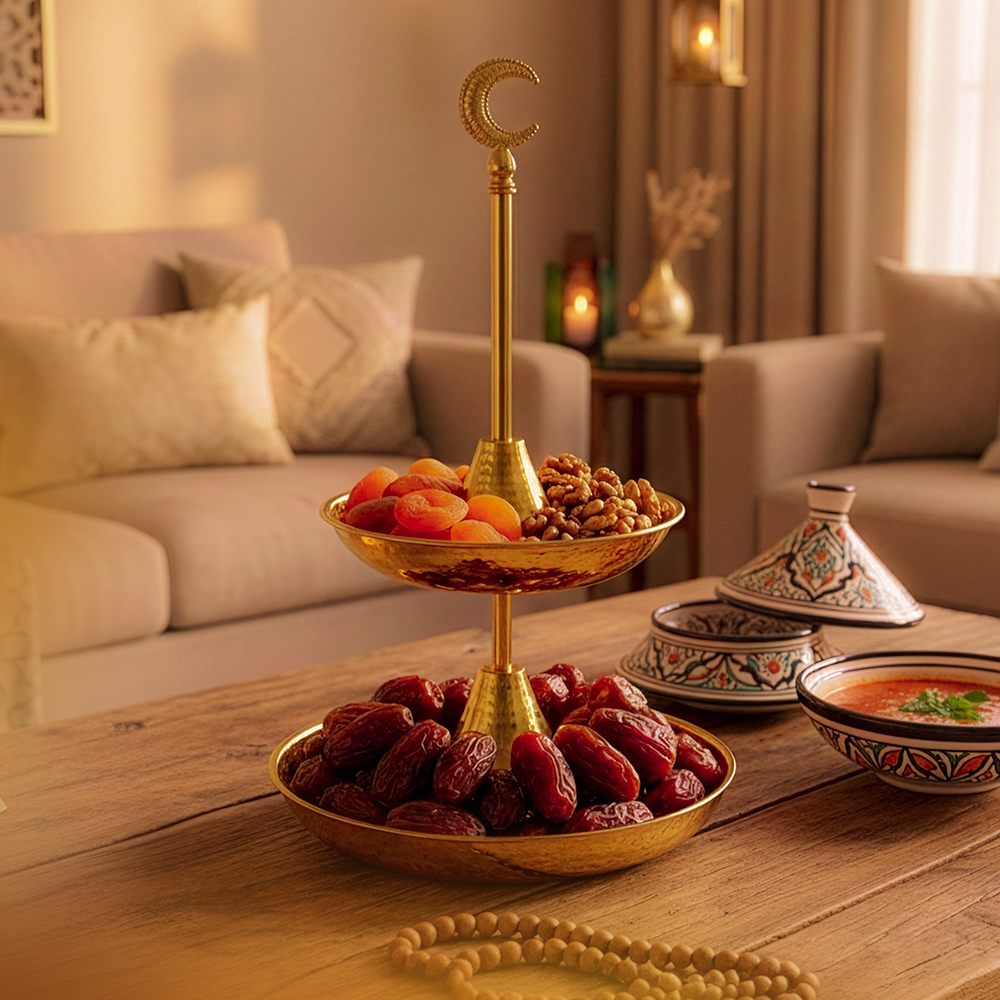 Su estructura estable y vertical permite ahorrar espacio en la mesa, mientras que la luna decorativa en la parte superior aporta una nota simbólica y festiva. Ideal para celebraciones, comidas informales o como pieza central.