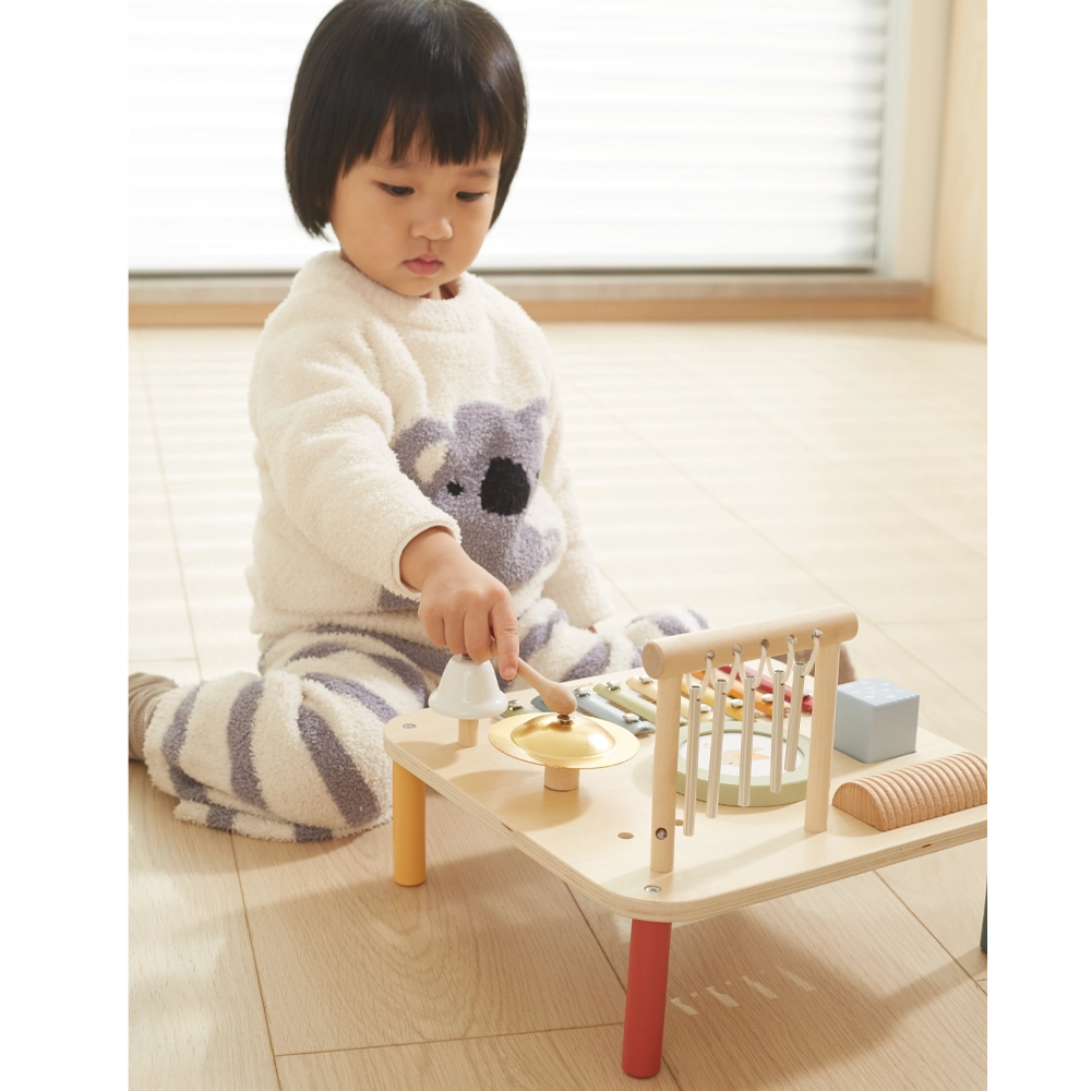 Xilófono de 8 láminas de colores – ideal para experimentar las primeras melodías.Tambor ilustrado – perfecto para descubrir el placer del ritmo.Platillos, campanilla y tubos metálicos – para sonidos variados y divertidos.Teclas de madera y pequeños sonajeros – que completan la experiencia sensorial y musical.