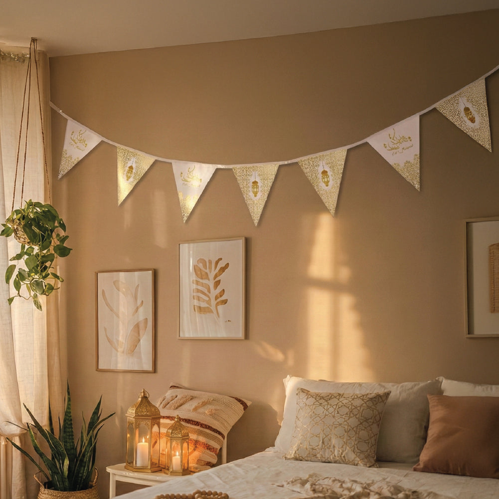 Composée de drapeaux dans des tons dorés et blancs, elle apportera une ambiance joyeuse et raffinée à vos espaces.