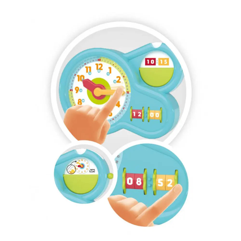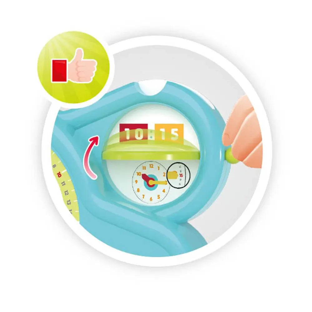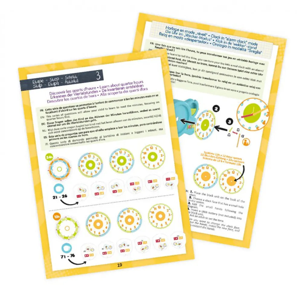 L'enfant peut choisir entre différents cadrans pour progresser graduellement dans son apprentissage de la lecture de l'heure. Les premiers cadrans illustrent les moments de la journée, tandis que le dernier reproduit fidèlement un cadran d'horloge traditionnelle.