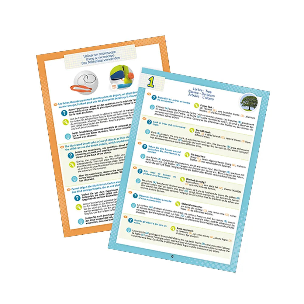 - Contenu : microscope x10 avec éclairage LED, pipette, pince, boîte de Petri, livret illustré et 10 fiches d’expériences.